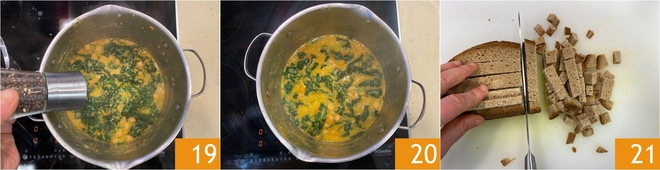 At the end of cooking adjust salt and pepper to taste 19 and let everything come together for another minute: the soup should be thick, creamy and comforting 20. Meanwhile, prepare the croutons: cut the rye bread into cubes 21.