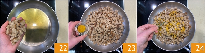 Heat a drizzle of oil in a wide skillet 22, then add the bread and toast it. Flavor with curry powder 23 and fresh thyme 34, mixing well to coat evenly.