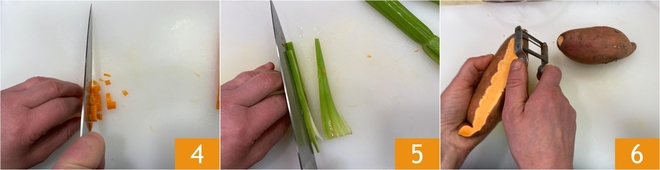 Do the same with the carrot 4 and celery 5. Now peel the sweet potatoes 6.