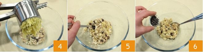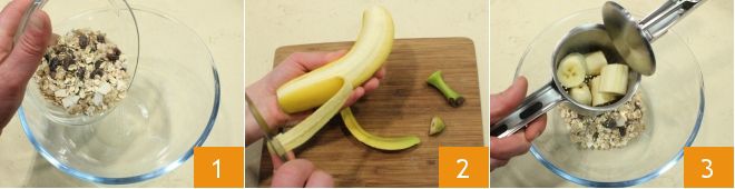 To make the two-ingredient cookies, start by pouring the muesli into a bowl 1, then peel the bananas 2, remove the strings, and cut them into pieces. Place the banana pieces in a potato masher 3