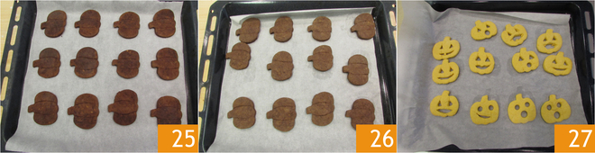 Cut out 20 cookies with pumpkin-shaped cutters about 2¾ inches 19. Make cuts with a small knife 20. Now roll out the light dough in the same way 21.