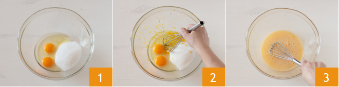 To prepare the two-tone plumcake, start by breaking the eggs into a bowl, add the sugar 1, the grated zest of one orange 2, and mix with a whisk 3.