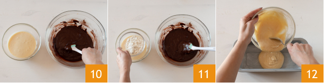 Incorporate by stirring with a spatula to avoid lumps 10. In the other bowl, incorporate the remaining flour, sifting and gently folding it in 11. Now, you need to pour the batter into a greased and floured 10 x 4 inch loaf pan. Follow a free pattern, scooping in some of the light batter 12