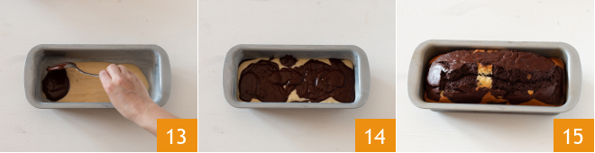 and then the dark one, alternating the scoops 13. Now, proceed with baking in a preheated static oven at 350°F for about 35 minutes. As soon as it is ready, remove your two-tone plumcake from the oven and let it cool slightly before removing it from the pan and cooling it on a rack 15.