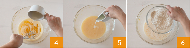 Then, still mixing, add the oil 4, the milk 5, and then 1 3/4 cups of sifted flour taken from the indicated amount 6.
