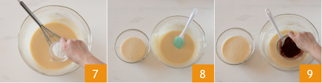 Finally, incorporate the sifted baking powder 7. At this point, divide the batter into two bowls 8 and add the sifted cocoa powder to one 9.
