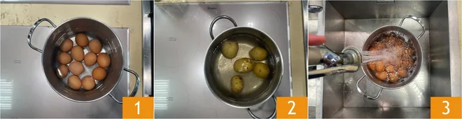 Peel the eggs 4 and collect them in a baking dish as you go 5. As soon as the potatoes are cooked, let them cool and peel them. When the eggs are also cool, cut off the top (about a quarter of the egg) 6 to create the container and the lid.