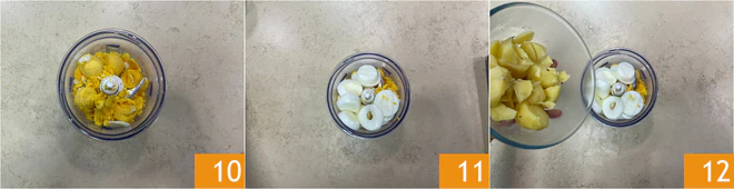 Gather the yolks inside a mixer 10; also add the egg white scraps 11 and the peeled potatoes, diced 12.