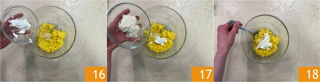 Add the cream cheese 16, mayonnaise 17 and mix well 18.