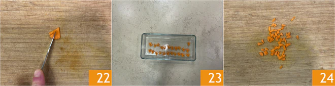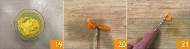 When you have a homogeneous mixture 19, transfer it into a piping bag with a 12 mm plain nozzle. Peel the carrot and cut it into thin slices 20. Cut the two sides of the slice to obtain a triangle with a curved side 21.