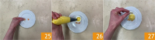 Now assemble the Easter stuffed eggs. Place the feet on a plate 25, place the egg white container on top and fill it with the egg and potato cream 26. Place the egg white lid 27.