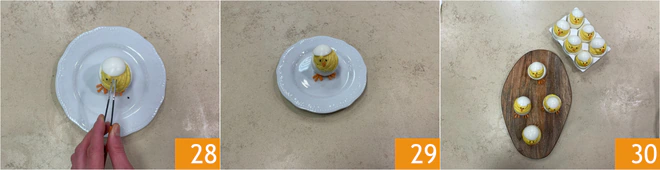 Create the eyes with black sesame seeds 28 and add the beak 29. Your Easter stuffed eggs are ready 30, store them in the fridge until serving time.