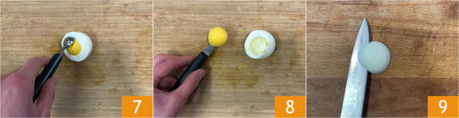 Remove the hard yolk using a scoop or a teaspoon 7 8. Trim the top part of the egg white you set aside 9 to make it slightly smaller.