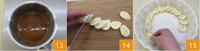 turn off the heat and set aside 13 (due to the presence of butter, the caramel will not harden). Peel the bananas, dice one banana, and slice the remaining bananas into rounds with a diagonal cut 14. Take a 9-inch diameter baking pan, butter it, and line the bottom with parchment paper. Arrange the banana slices on top, placing them next to each other, slightly overlapping, starting from the perimeter to cover the entire bottom of the cake pan 15.