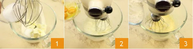 To make the upside-down peach and amaretti cake, place the softened chopped butter and granulated sugar in the bowl of a stand mixer fitted with a whisk 1, turn on the whisk to mix the ingredients and obtain a cream, then add the eggs 2, the seeds of the vanilla bean, the sifted flour, and baking powder 3.