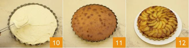 At this point, pour the cake batter over the peaches, level it with a spatula 10 and bake in a static oven at 350°F for 45 minutes (or in a convection oven at 320°F for 35 minutes). Once baking is complete, remove the pan from the oven 11, let it cool, and then flip it onto a serving plate. Your upside-down peach and amaretti cake is ready to be enjoyed 12!