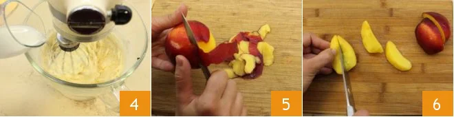 Pour the milk in a thin stream 4 while the machine is running. Wash, peel the peaches 5 and cut them into wedges 6.