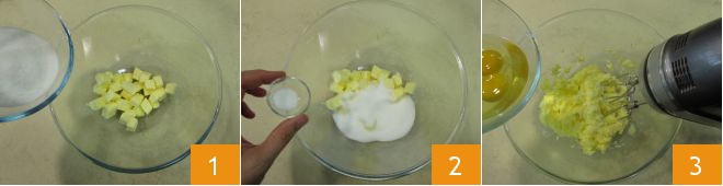 To prepare the upside-down pear and chocolate mini cakes, start by placing the room temperature butter in a bowl with the sugar 1 and a pinch of salt 2. Turn on the mixer and add the eggs one at a time, allowing them to gradually incorporate 3.