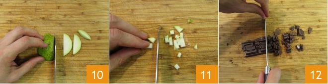 Slice the remaining part 10 and cut it into cubes 11. Finally, chop the dark chocolate 12.