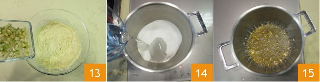 In the bowl with the batter, add the pear cubes and the dark chocolate, and mix everything together 13. Move on to the caramel. In a steel saucepan, pour the sugar and water 14, turn on the stove to medium temperature, cooking it until the caramel turns amber in color 15.