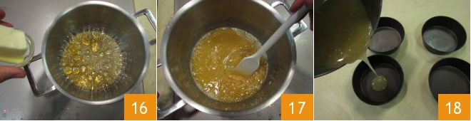 Turn off the heat and remove from the stove, then add the butter 16 and mix well 17. Transfer the butter caramel into four 3.5-inch molds 18