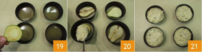 Now place the 4 pear slices you set aside earlier 19, cover with the batter 20, leveling it carefully 21.