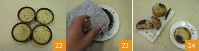 Proceed to cooking. Bake the mini cakes in a preheated static oven at 356°F for about 30 minutes 22. When they are cooked, and still hot, place a plate on the mold and flip the cake using a potholder 23. Here are your upside-down pear and chocolate mini cakes ready 34.