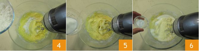 Continue by adding the sifted all-purpose flour 4, slowly pour in the milk 5, and then the baking powder 6.