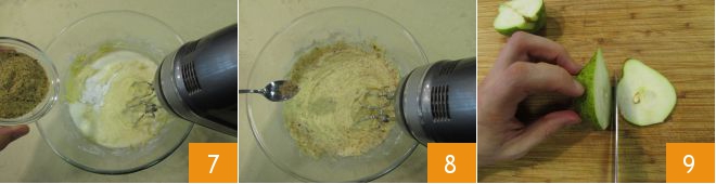 Only the hazelnut flour 7 and ground cardamom 8 are missing. Once the batter is well combined, turn off the mixer and attend to the pears. After washing and drying them, remove the stems and set aside 4 thin slices 9.