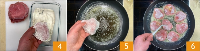 Next, dredge each slice in flour, pressing lightly and shaking off the excess 4. Place the cutlets in the hot pan 5 and brown them over medium-high heat for a few minutes on each side until golden 6; during cooking, season with salt and pepper to taste.