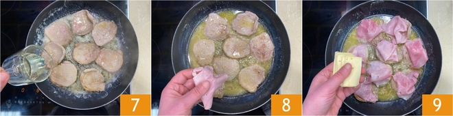 When the meat is well browned, deglaze with white wine and let the alcohol evaporate completely to get a fragrant and tasty base 7. At this point, slightly lower the heat and place a slice of cooked ham 8 and a slice of Fontina 9 on each piece of meat.