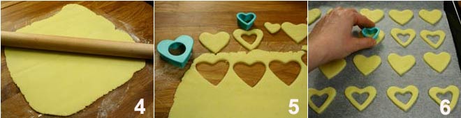 With a rolling pin, roll out a sheet no thicker than 1/5 inch 4, and with the heart-shaped cutter, cut an even number of shapes, remembering that you will need two to make one cookie. At this point, on half of the hearts obtained, make incisions with a cutter, also heart-shaped but smaller (5-6); then place all the hearts on a baking sheet lined with parchment paper, and bake them at 356°F for about 15-20 minutes.