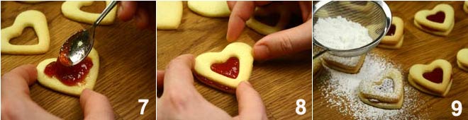 The cookies should not darken, but only barely color; when they are cooked and still warm, place some strawberry jam on the uncut shape 7, and place the cut-out shape on top 8. The cookies thus obtained should be dusted with powdered sugar 9, and... happy Valentine's Day!