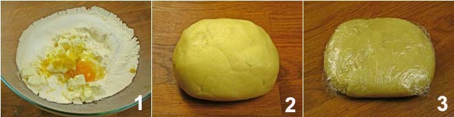 Place the flour on a work surface, and in the center, add the butter and all the other ingredients, including the vanilla bean seeds 1; work the mixture very well until you obtain a smooth and homogeneous dough 2. Wrap it in plastic wrap and let it rest for at least half an hour in a cool place 3.