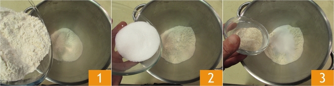 To make the donuts, first, slightly warm the milk that you will need to prepare the dough. Meanwhile, pour the all-purpose flour and bread flour into the bowl of a stand mixer fitted with a dough hook 1. Add the sugar 2 to the dehydrated sourdough yeast 3.
