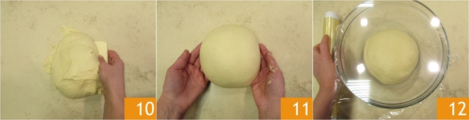 Detach the dough from the hook with slightly dampened hands, then use a dough scraper to turn it out onto the work surface 10. Dust with a little flour and shape the dough into a ball, using a dough scraper to handle it more easily 11. Transfer it to a large bowl, previously buttered, cover with plastic wrap, and let it rest for 2 hours in the turned-off oven with the light on 12.