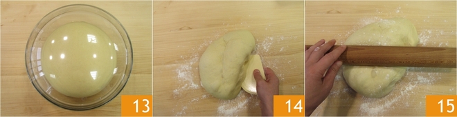 After the rising time, the dough will have doubled. Transfer it again to the lightly floured work surface 14 and roll it out with a rolling pin 15.