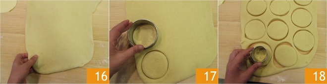 You should obtain a thickness of 0.4 inches 16. Using a 3 inches diameter round cutter, cut circles from the dough 17, placing them close together. At this point, using a smaller, 2 inches cutter, cut out the donut holes 18.