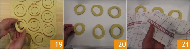 Gently lift the donuts 19 and place them on squares of parchment paper about 4 inches on each side placed on a tray 20; also transfer the dough scraps to a parchment-lined tray. Cover the trays with a kitchen towel 21 and let them rise for 40 minutes away from drafts.