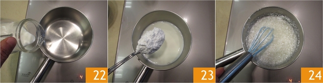 When the donuts are almost risen, you can start preparing the glaze. Transfer the milk into a saucepan 22, warm it, and add the powdered sugar 23. Stir with a whisk as you go 34.