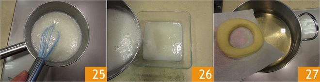 Cook until the mixture thickens 25, transfer it to a small bowl 26, and let it cool. Move on to frying. Heat the seed oil in a large pot until it reaches a temperature of 350°F. When the oil is hot, lift the first donut using the parchment paper and immerse it in the oil 27. Using the parchment paper ensures that the shape does not change.