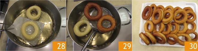 After a few seconds, you can remove the parchment paper using kitchen tongs 28. Turn them on both sides with a slotted spoon until they are evenly golden, this will take about 3 minutes 29, then drain on paper towels 30. Immerse the dough scraps in the oil as well and fry them to make the famous donut holes.
