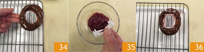 Lift it and turn it upside down on a rack 34. Stain plastic vampire teeth with jam 35 and place them inside the donut hole. Then decorate with the candy eyes 36.