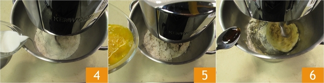 Start the stand mixer at moderate speed and pour in the milk slowly 4. Add the eggs little by little so as not to weigh down the dough 5 and flavor with vanilla extract 6.