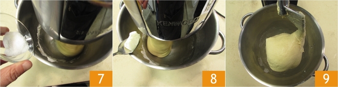Finally, add the salt 7 and continue working until the dough detaches from the sides of the bowl and is well-mixed. At this point, you can add the softened butter, one piece at a time 8, ensuring that each piece is well absorbed before adding more; this will take about 15-20 minutes. You should obtain a smooth and homogeneous dough 9.