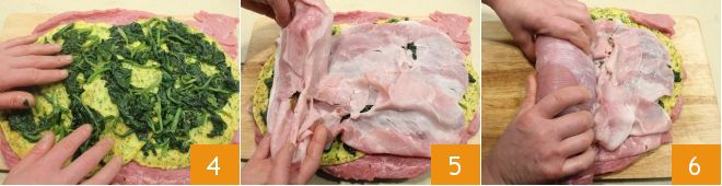 then evenly distribute the already cooked spinach 4 and the slices of cooked ham 5. Roll the veal from the shorter side 6