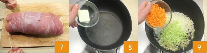 and tie it with kitchen string 7. For the best way to do this, consult our guide How to tie a roast. In a pot with rather high edges, melt half the butter 8 and add a dash of oil, and when the butter is melted, let the finely chopped onion, celery, and carrot wilt 9;