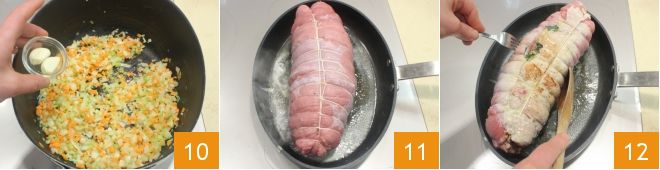 When the sauté is well consumed, add the veal roast with its cooking juices 9. Then deglaze with the wine 13, once it has evaporated, you will add the already hot milk 14. Cook the veal roll for about 50/60 minutes, covering it with a lid 15.