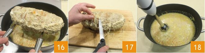 Remove the roll from the pot 16 and eliminate the string 17. Extract the cloves of garlic and bay leaves from the cooking juice; adjust the salt and blend the juice with an immersion blender 18