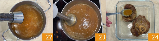 Season the sauce with salt and pepper 22 and return it to the heat to warm it up. You can blend it further with an immersion blender to achieve a smoother, more homogeneous consistency 23. Coat the veal shanks with the hot sauce 34.